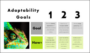 Twitter FAcebook LinkedIn Email Insights & Perspectives • Announcement Putting Descartes Before the Report: Telling Your Evaluative Story with the Grid Design System Rose Konecky, Consultant, Evaluation and Learning I’m Rose Konecky, Evaluation and Learning Consultant at TCC Group. I’m here to turn you into a creator of visualization masterpieces. Really! As evaluators, we always have a story to tell, but we sometimes limit ourselves to words (which, of course, are important) and canned chart creators (also important!). I’m here to show you how to optimize storytelling using innovative visual design principles. Don’t worry – a lack of artistic talent won’t stand in your way. In fact, the technique I’m about to describe is more of a science than an art. It is called the Cartesian Coordinate System, and you can leverage it with or without creative abilities using five concrete steps. This tactic will benefit both evaluators and their clients by ensuring that the data that can be so hard to gather doesn’t land with a thud. Instead, it will unite and convey a presentation’s elements clearly to the intended audience. When presenting evaluation data, we tend to lean heavily on displaying charts and tables and then augmenting them with descriptive text. But you will be able to tell a story more effectively if you weave in these key elements of visual design instead of using that tactic. It also has the added benefit of increasing accessibility, reaching individuals who learn best in different ways. With increased proficiency in the system, you can use data, words, and images to tell a story, or even call your audience to action. The following five steps will help to bring structure and balance to your visual communication. Start with a sheet. This technique requires nothing more than a blank PowerPoint slide – or even a blank sheet of paper. Add margins. Designate a space along the border of your slide where you cannot put any content. Reserving white space here gives the reader’s eyes an opportunity to rest. Add an erasable (or delete-able) grid. If you’re working in PowerPoint, draw or paste in light gray grid lines spanning the free space. It should have (approximately) 12 columns, 6 rows, and “gutters” in between. You can create it on your own or use the linked YouTube video to walk you through it. It will look something like this: Fill the open squares. Now comes the fun part – content. Your job is to fill the free spaces with key elements or key content, in whatever permutation you’d like. The only rule is not to stop in the middle of a gutter (the margins between columns). See the example below where I decided on the location of sample content. Delete the grid itself. You will be left with a balanced and bold presentation that dazzles the eye. Below is an example of where I adapted a text-only slide using the grid system. Key Takeaways There are few barriers to use. All you need is an understanding of Microsoft Office programs and something to say! You are ready to make your findings into art. Break the rules sometimes! The only “rule” mentioned above was no content in the gutters. But even that rule can be broken once in a while. In fact, it might result in something equally striking, which would stand apart from previous slides and add visual spice to your presentation. It’s clear that I’m an evaluator who is passionate about PowerPoint, and I look forward to speaking in person with you about it at the American Evaluation Association Evaluation 2023 Conference poster exhibition session on Wednesday, October 11. It will be very impactful to show rather than tell about this technique, and even have a chance to workshop slides in real-time with audience examples. Let me know if you will be there! I’d also love to hear about your visualization techniques or share more about our work- reach out at info@tccgrp.com. Additional Resources: Watch the referenced “How to Create Slide Design with the Grid” video on YouTube. Visit Unsplash.com com for brilliant and royalty-free images such as the chameleon shown above. Visit Coolors if you want a striking color scheme but don’t know where to start. October 5, 2023